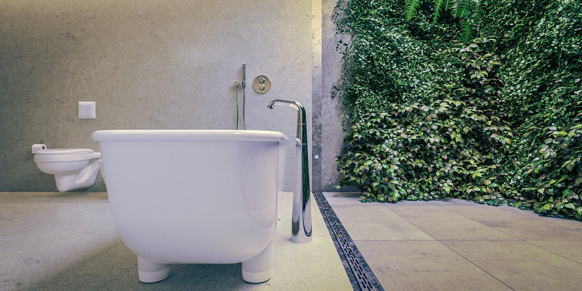 A simple open plan bathroom with generous proportions to make the space flexible and filled with light whislt being private.